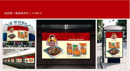 远距离(售卖地点外)100米范围内的品牌诉求信息传达。